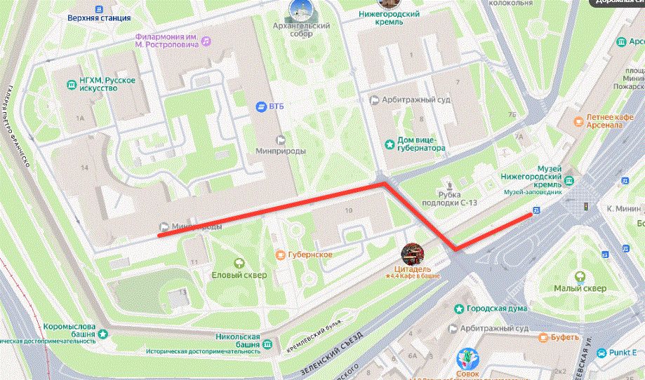 Для представления документов непосредственно в комиссию необходимо проехать на автобусах 1, 3, 19, 31, 39, 40, 42, 45, 52, 61, 64, 68, 70, 71, 74, 90, 91, 95, 97, 226, э13; маршрутное такси т24, т304, т40, т45 до остановки общественного транспорта «Площадь Минина и Пожарского». Затем пройти пешком до административного здания, расположенного по адресу: г. Нижний Новгород, Кремль, корп. 14 (маршрут указан на схеме).