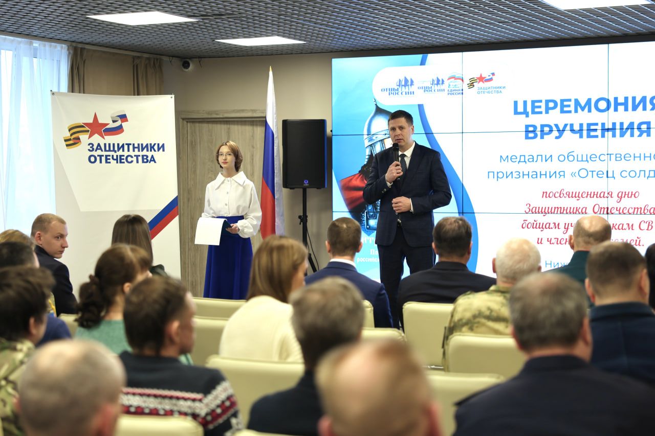 17:49В нижегородском филиале фонда «Защитники Отечества» в преддверии праздника для ветеранов СВО и членов их семей было организовано торжественное мероприятие и концерт. Заместитель губернатора Нижегородской области Андрей Гнеушев и председатель регионального отделения движения «Отцы России» Дмитрий Исаев вручили нижегородцам медали общественного признания «Отец солдата».