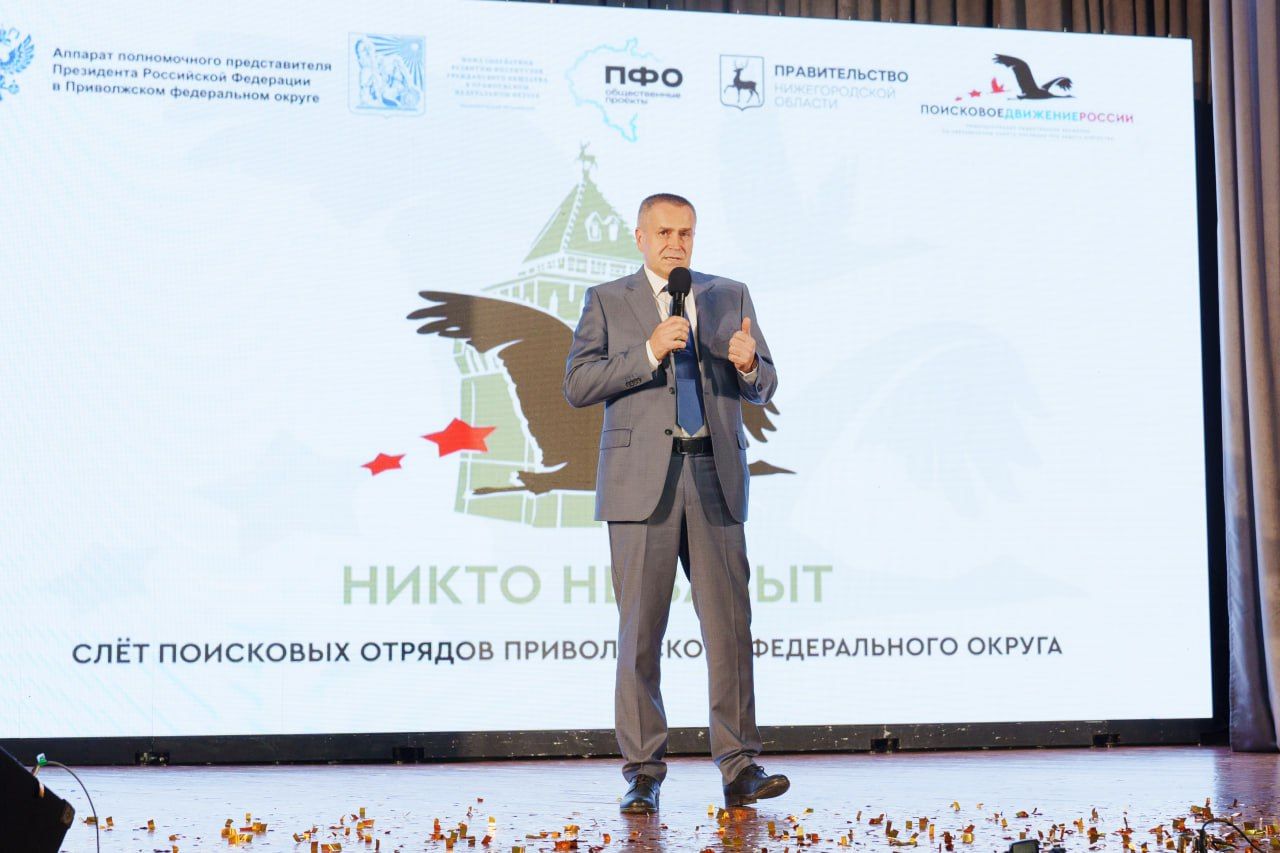 «За одиннадцать лет реализации окружного общественного проекта по поддержке поискового движения количество поисковых отрядов увеличилось на 70%. Число тех, кто участвует в поисковых отрядах в Приволжском федеральном округе, выросло в два раза — с 5-ти до 11,5 тысячи человек. Конечно, слет бы не состоялся без наших наставников. Я благодарю „Поисковое движение России“, Министерство обороны Российской Федерации за поддержку поисковых отрядов в округе, а правительство Нижегородской области и лично губернатора Глеба Сергеевича Никитина — за предоставленную возможность ежегодно встречаться здесь, в Нижнем Новгороде», — обратился к участникам конкурса Олег Машковцев, вручая гран-при победителям слета.