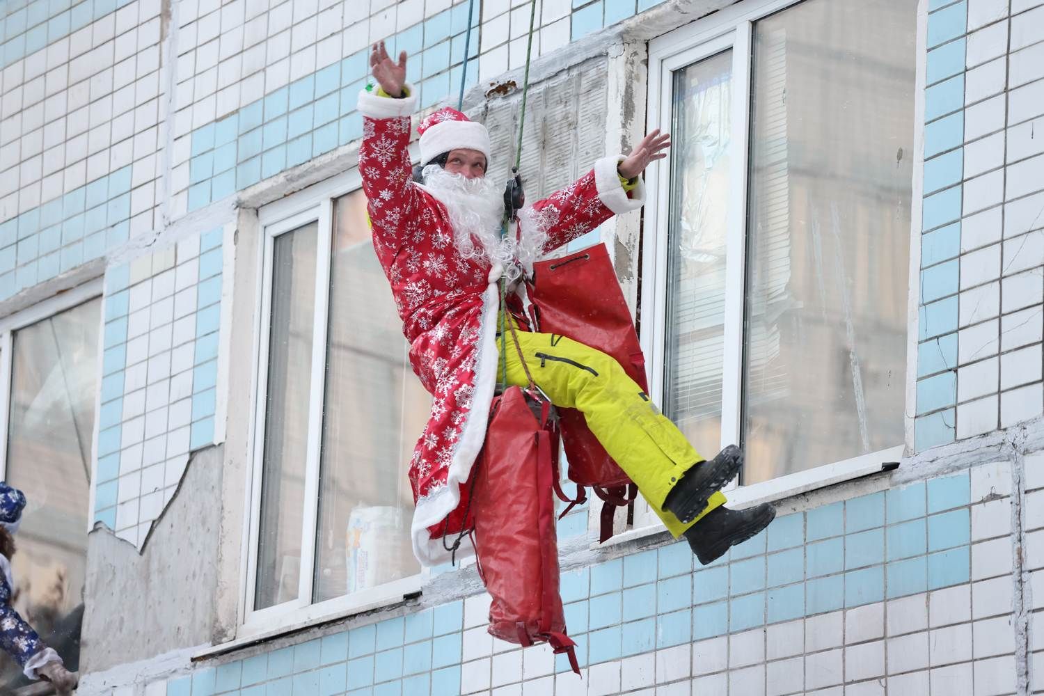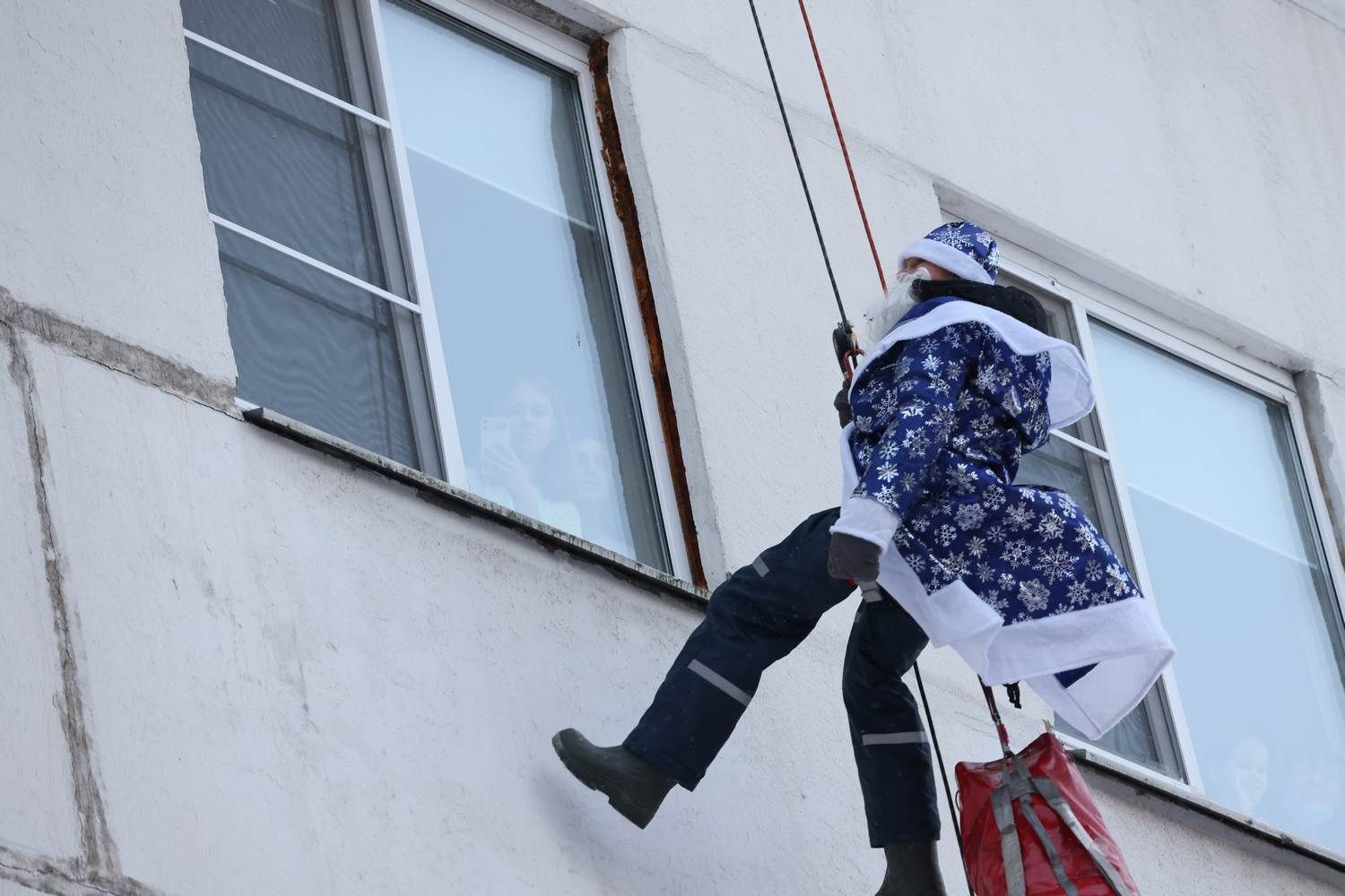 Деды Морозы–альпинисты постучались в стекла к детям, спустившись с крыши. Раскачиваясь в воздухе, они поприветствовали ребят, их родителей и медицинский персонал на всех этажах.