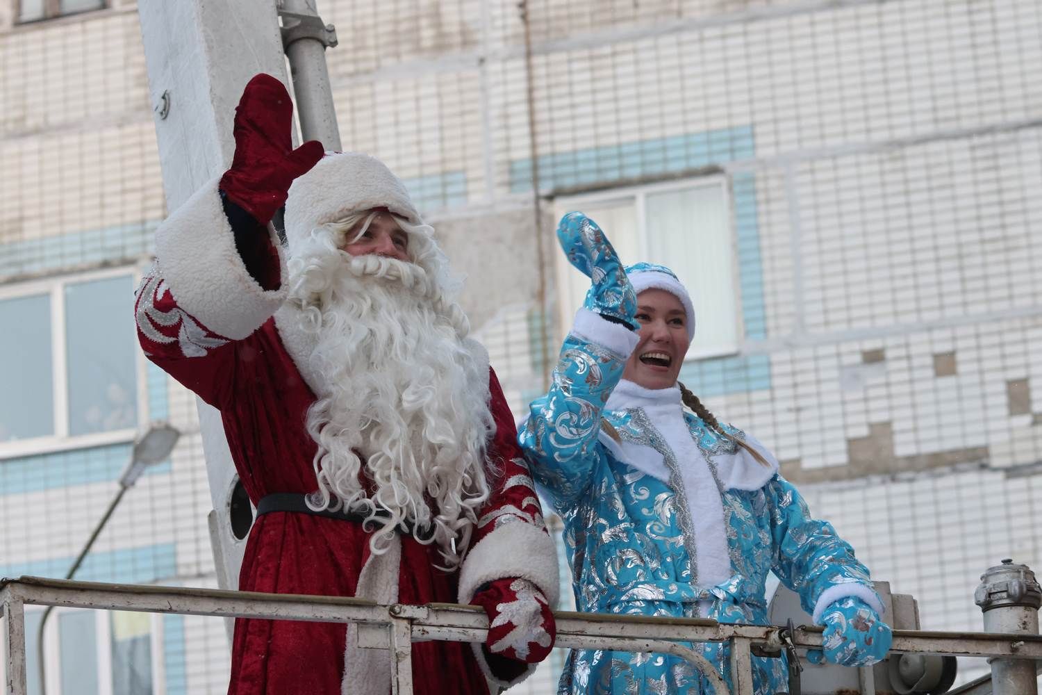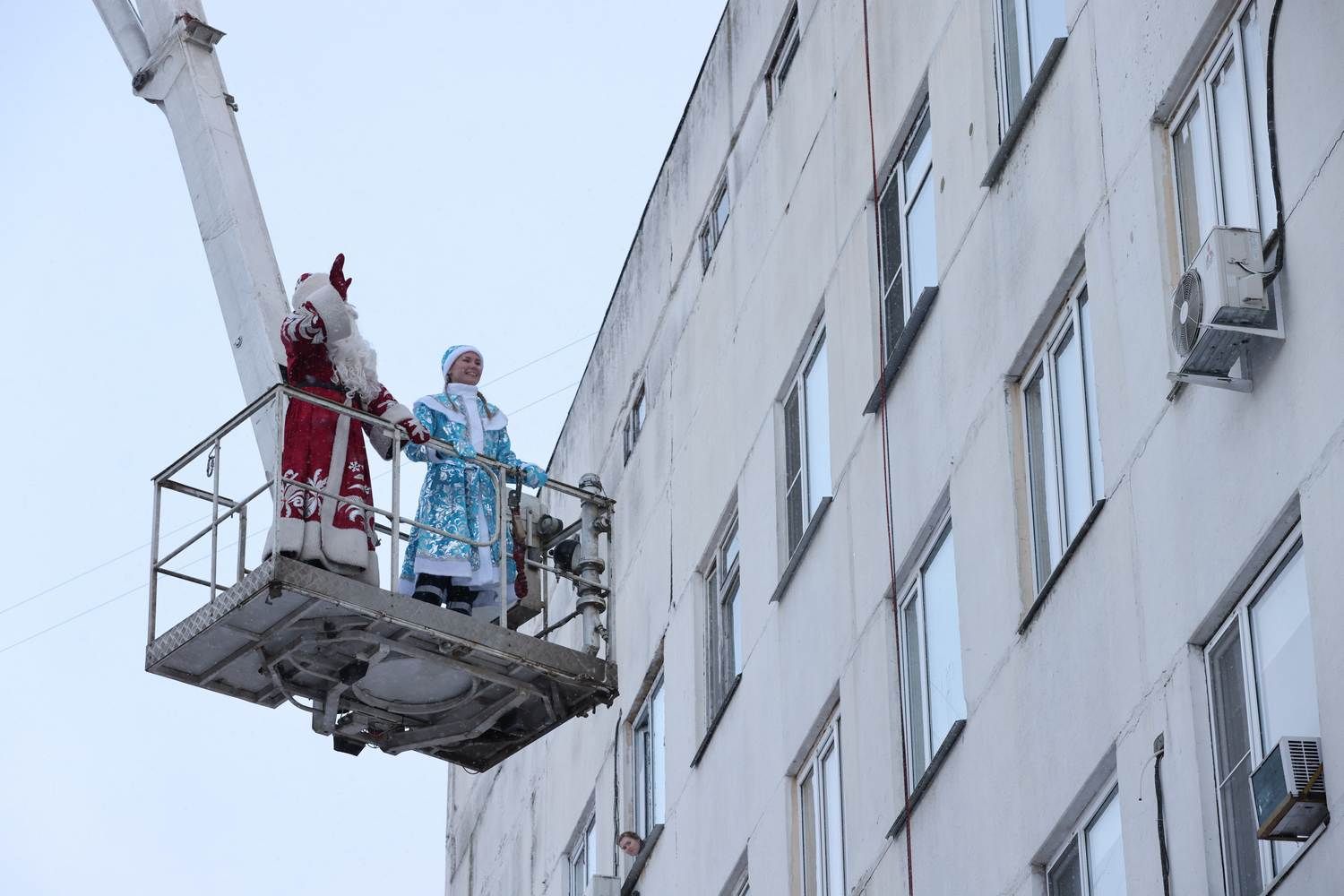 Дед Мороз–пожарный и Снегурочка поднимались к детям с помощью коленчатого подъемника. Они также приветствовали детей и взрослых улыбками и жестами.