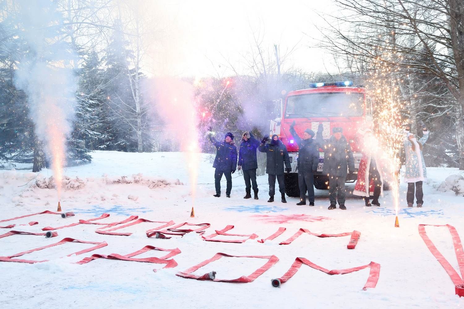 В это же время другие специалисты-спасатели выложили из «пожарных рукавов» надпись «С Новым годом!» на территории между больничных корпусов и зажгли фейерверки.