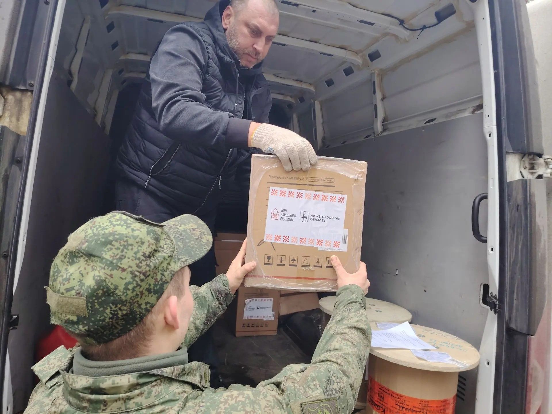 Также артисты привезли гуманитарный груз, в составе которого — оборудование и кабели для оптоволоконной связи, радиостанции, противодроновые плащи, оргтехника и другие необходимые материалы, приобретенные на личные средства актеров нижегородских театров и активистов областного профсоюза работников культуры.