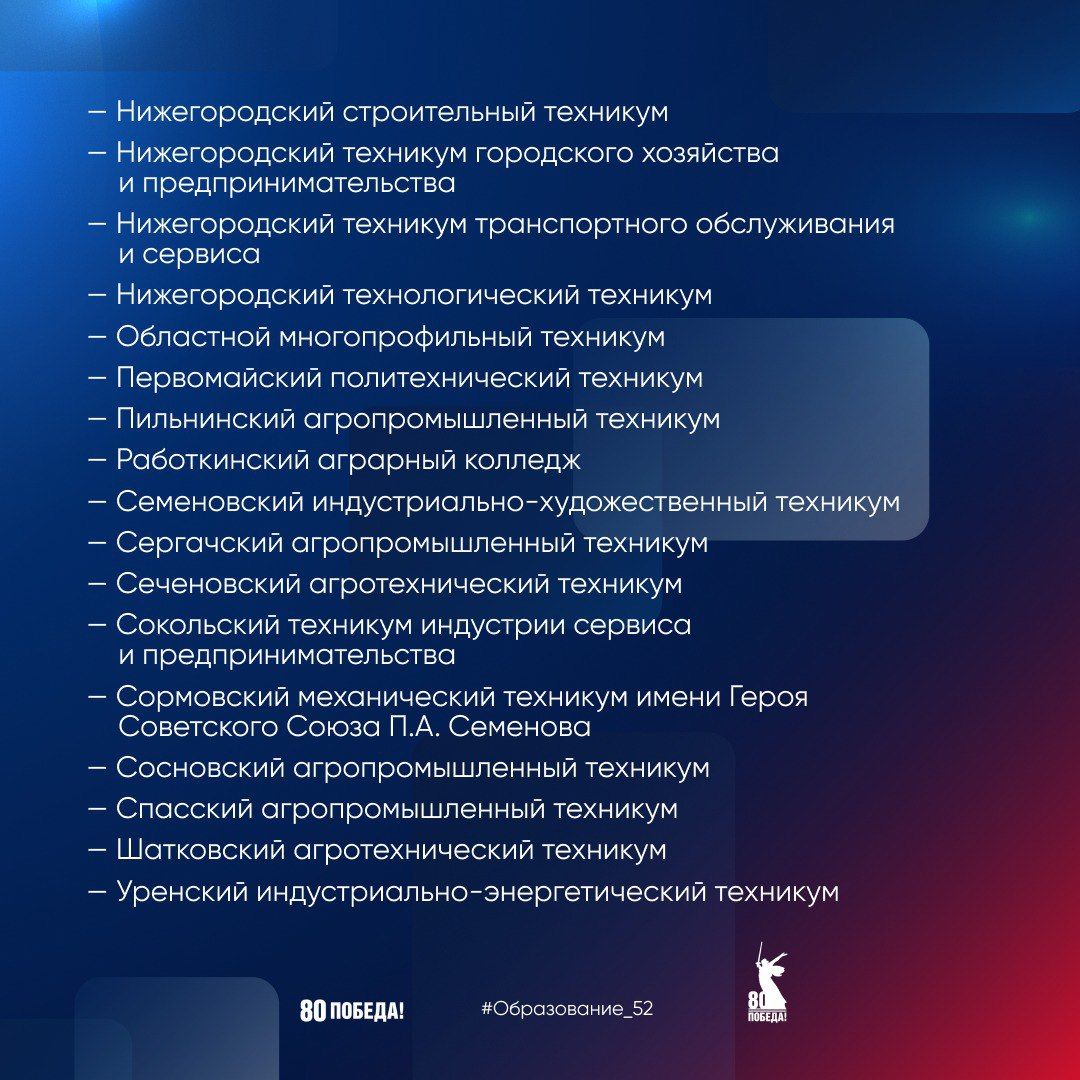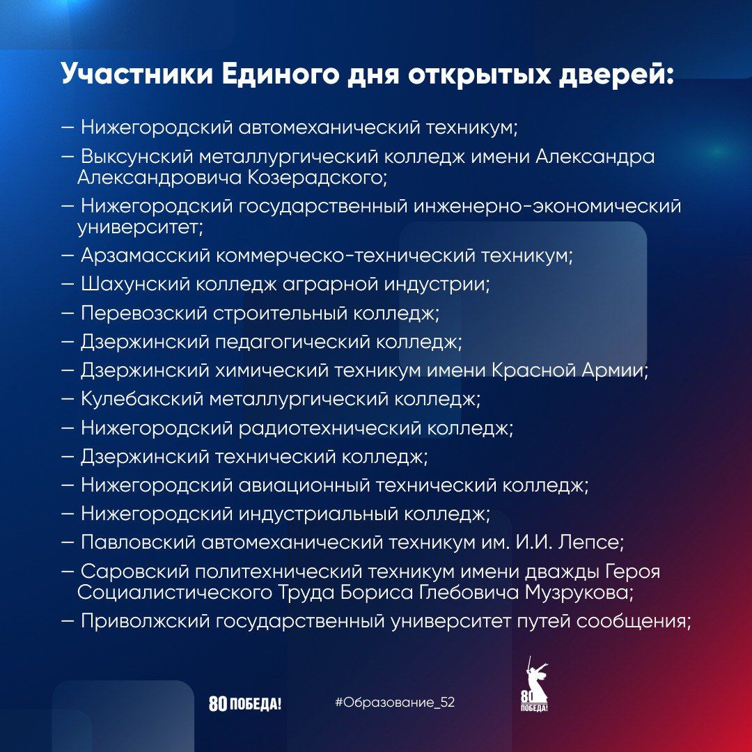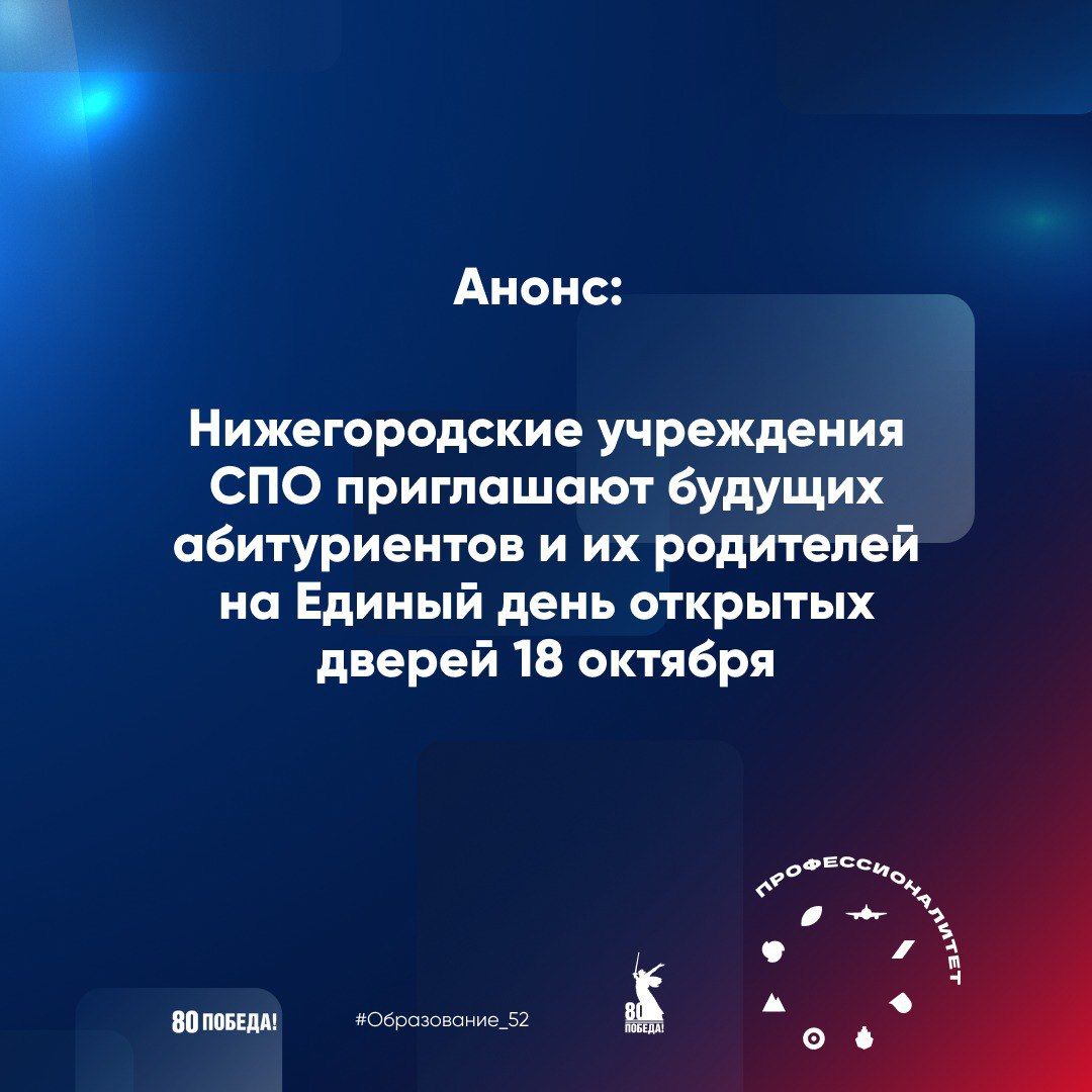 12:1118 октября колледжи и техникумы Нижегородской области, входящие в федеральную программу «Профессионалитет», станут участниками Единого дня открытых дверей. Будущих абитуриентов и их родителей примут сразу в 49 образовательных учреждениях региона. Специалисты расскажут о востребованных профессиях и преимуществах обучения в рамках «Профессионалитета».