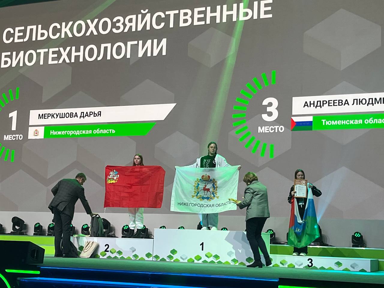 Сразу четыре награды в финале завоевала студентка Лукояновского Губернского колледжа Дарья Меркушова. Они удостоена золотой медали в индивидуальном, индустриальном и международном зачетах, а также серебряной медали в командном зачете по компетенции «Сельскохозяйственные биотехнологии».