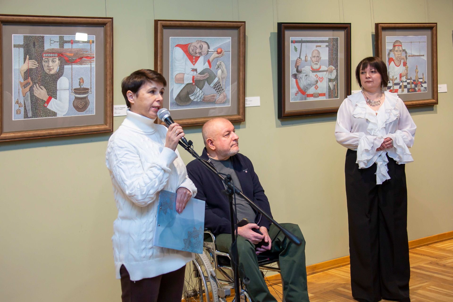 «С точки зрения композиции квадрат — очень сложный формат для художника, требующий идеальной продуманности и гармоничного наполнения. Выбрав эту форму, автор поставил перед собой задачу создать полноценный образ персонажа путём сочетания композиционных элементов, стилизации, деформации отдельных частей, продумывая каждую линию. Художник не изображает конкретных людей, но у каждого его персонажа всегда есть душа, история, время», — отметила куратор выставки, заведующий отделом экспозиционно-выставочной деятельности Нижегородского художественного музея Ольга Ёлкина.