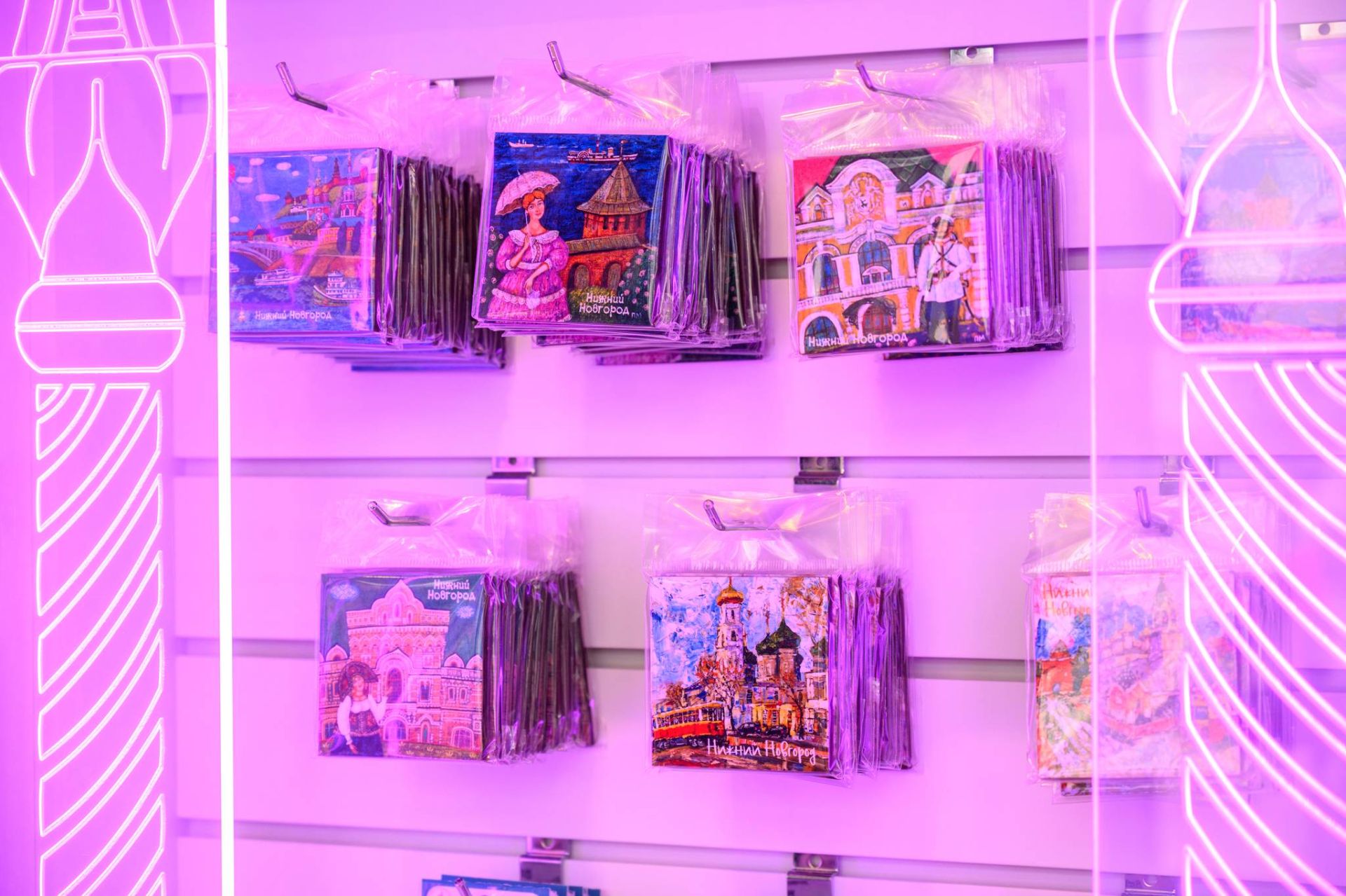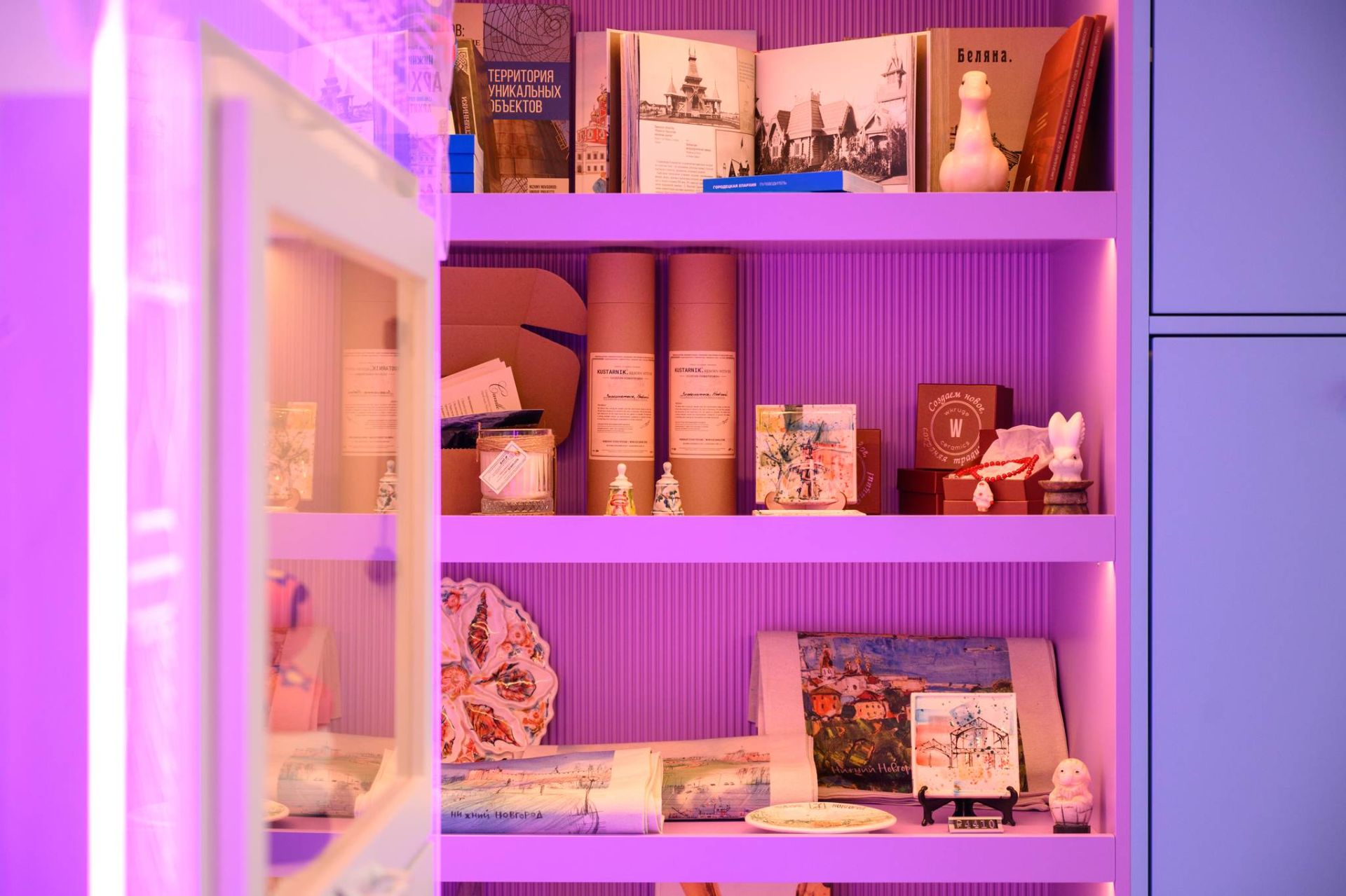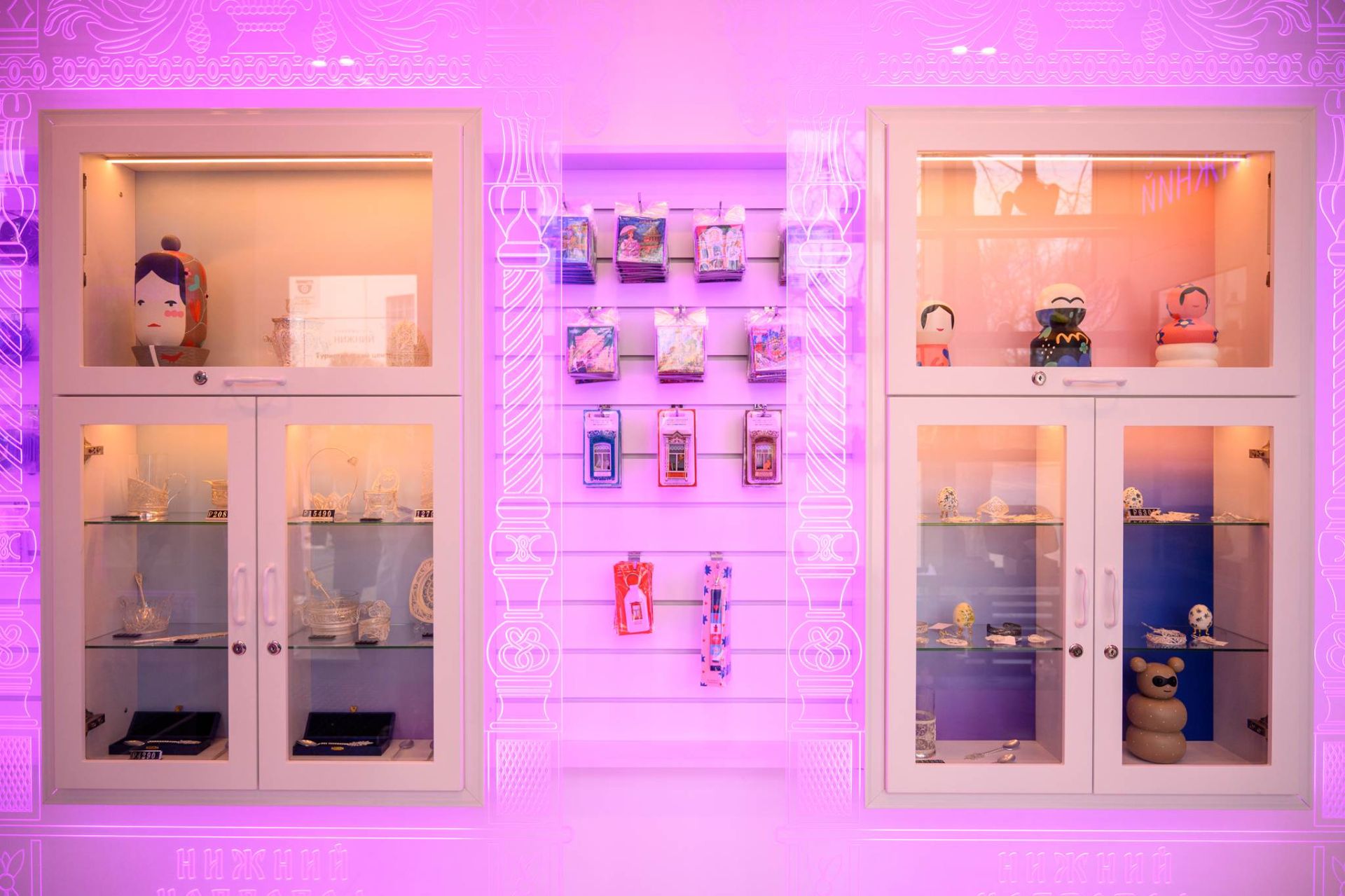 В обновленном пространстве появилась большая зона для сувениров с витринами, стилизованными под нижегородские наличники. Гостям предлагают изделия народных художественных промыслов региона: это и казаковская филигрань, и изделия с хохломской росписью, и борнуковская игрушка и многое другое. Здесь же представлены авторская керамика, парфюмерия, книги по краеведению и иные товары.