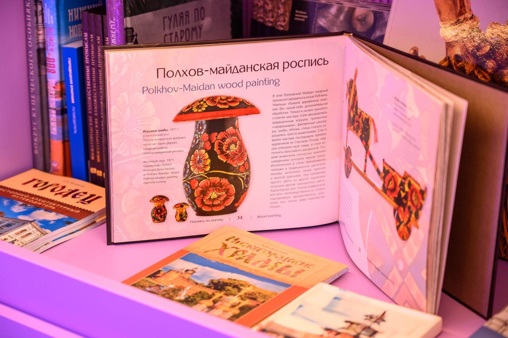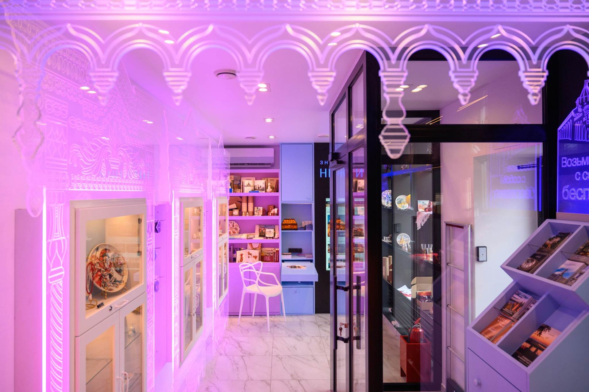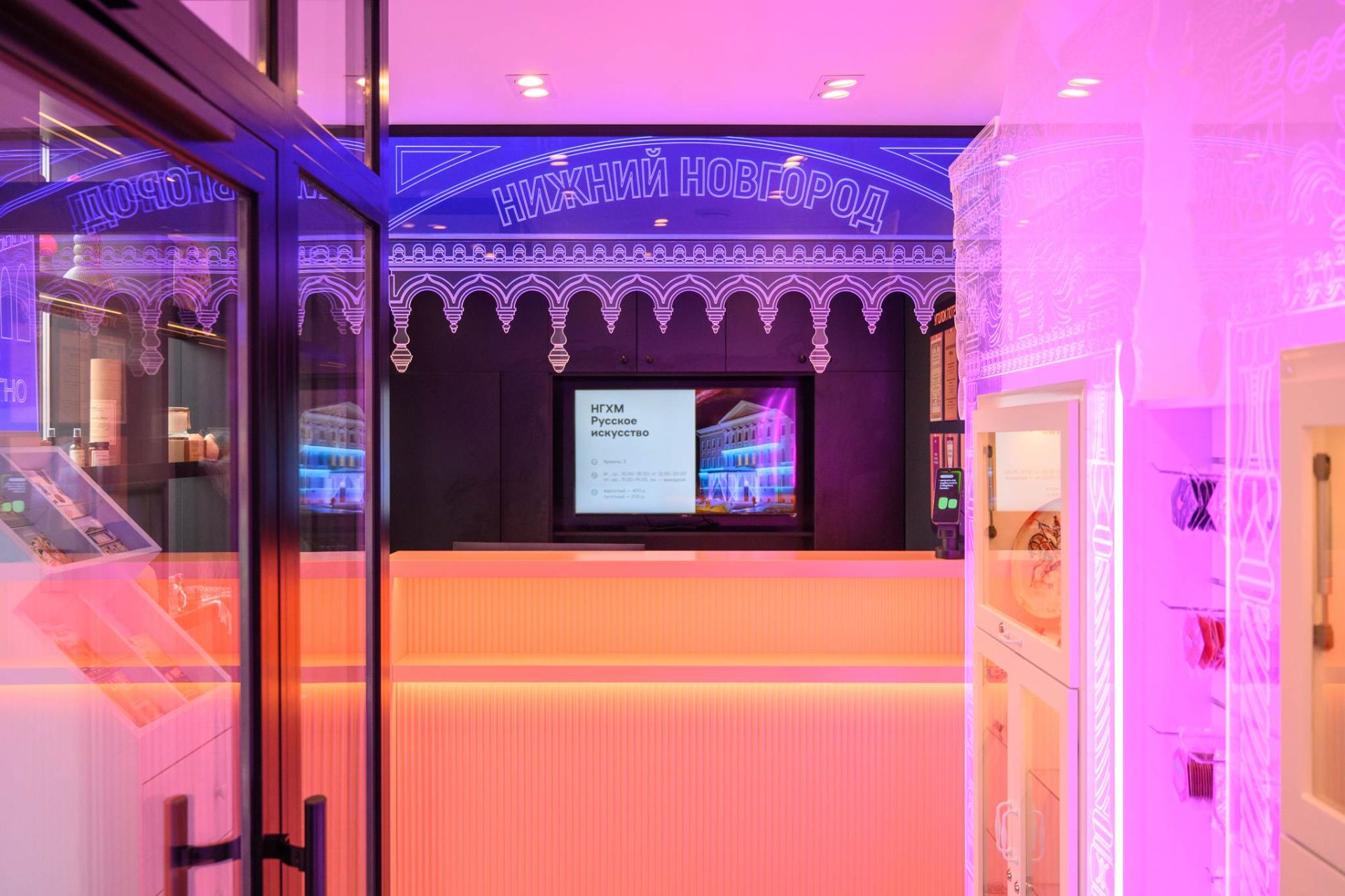 В обновленном пространстве появилась большая зона для сувениров с витринами, стилизованными под нижегородские наличники. Гостям предлагают изделия народных художественных промыслов региона: это и казаковская филигрань, и изделия с хохломской росписью, и борнуковская игрушка и многое другое. Здесь же представлены авторская керамика, парфюмерия, книги по краеведению и иные товары.