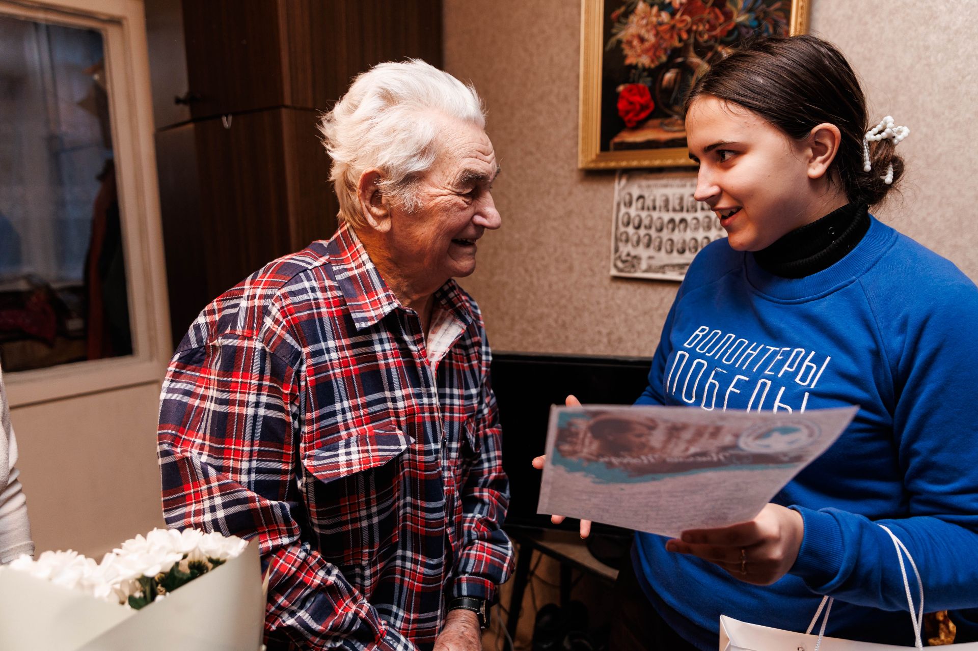 В домашней обстановке волонтёры пообщались с ветераном. Он поделился историями из жизни, показал фотографии из личного архива и поблагодарил ребят за их внимание и заботу.